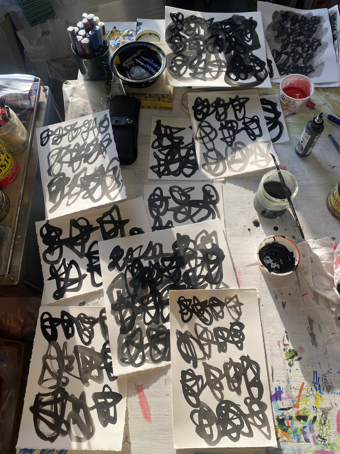 Above: A bunch of glyph drawings in acrylic on printmaking paper made today (3.14.25)