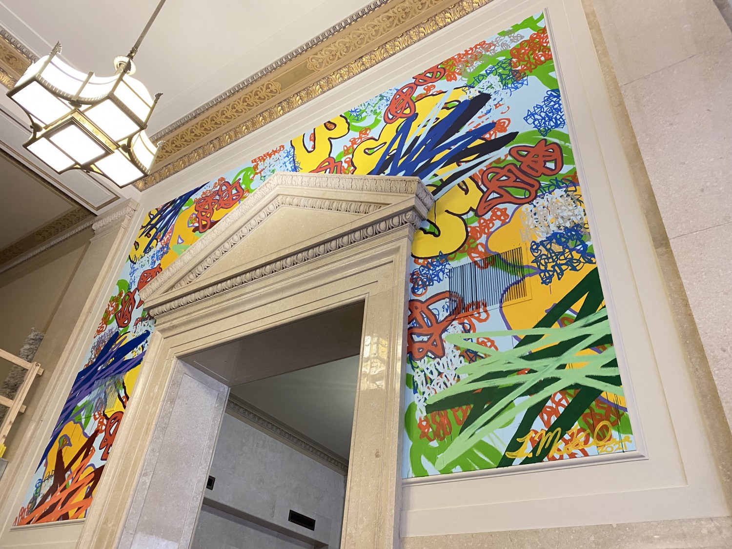 In October 2021, I was commissioned to create an indoor mural for the future offices of Philadelphia-based Coscia Moos Architecture. Considering the grand height and marble-covered walls of this space, I made a design that contrasts with the hard grids of the space. The design features colorful glyphs and other marks being made on a diagonal axis so as to create a sense of movement from lower right to upper left.