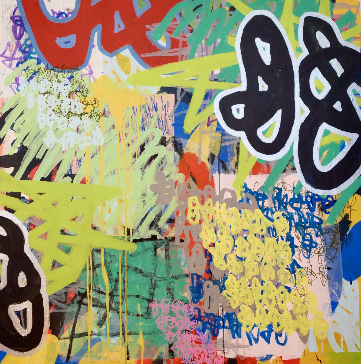 Once Upon A Time Called Right Now, 2022, acrylic, collage and marker on canvas, 40 x 40 inches SOLD soldTAGS: paintingcontemporary arttim mcfarlaneonce upon a time called right nowacrylic on canvasbridgette mayer gallery