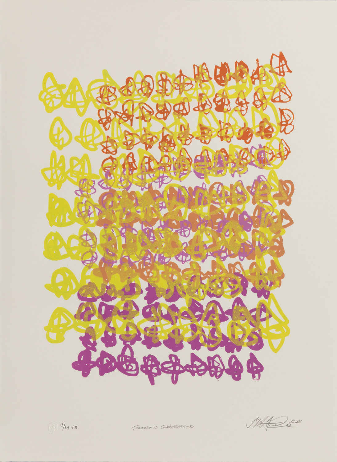 Tomorrow's Conversations, 2020, woodblock, ink on paper, 29.5" x 21.5", print 3 of 34, variable edition